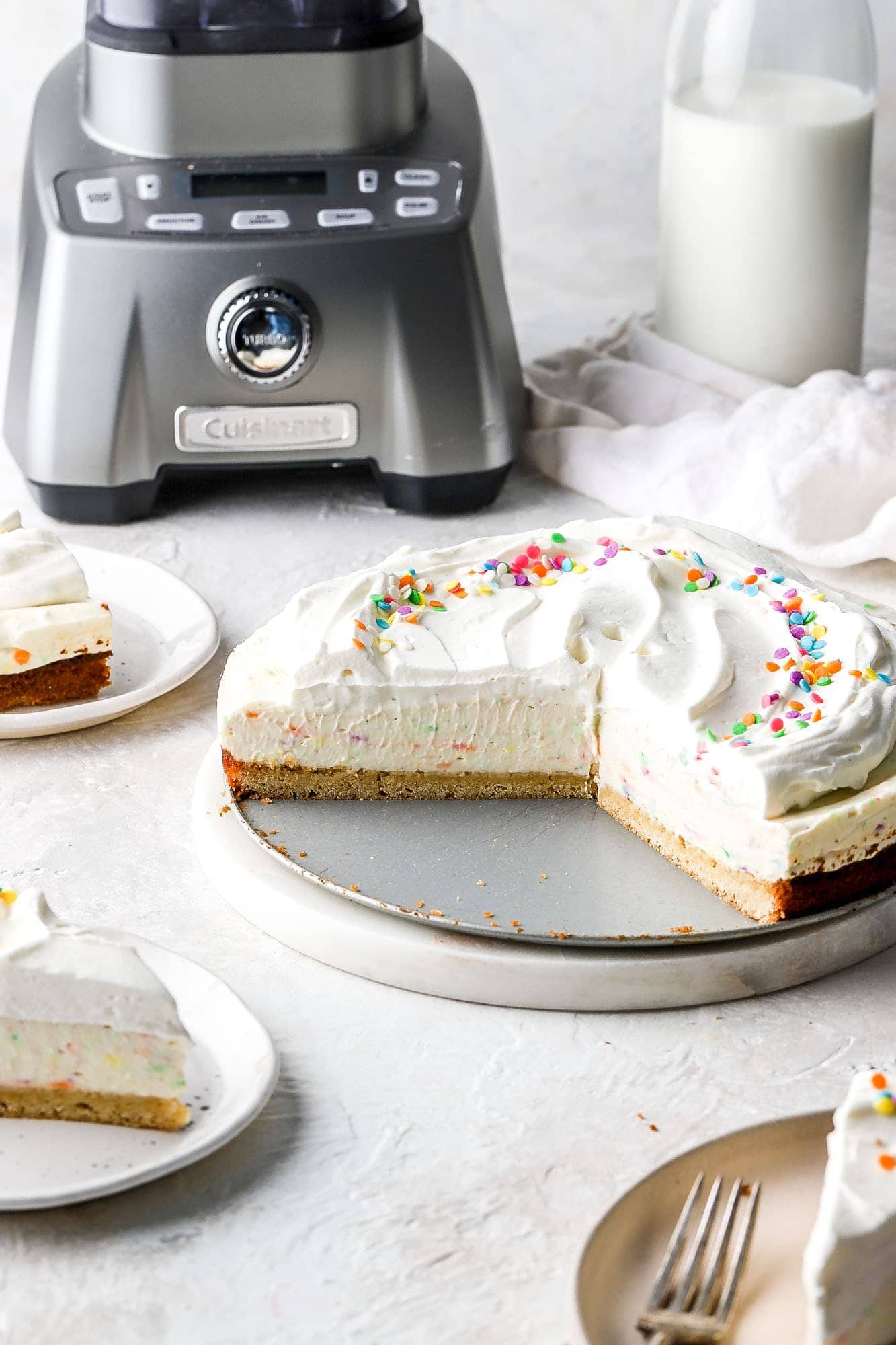 Hello friends! It’s not my birthday but I mean, after the year we’ve had, do we really need a reason to celebrate with birthday cake cheesecake? Didn’t think so. So I partnered with my favs over at Cuisinart to bring you this super simple, almost no-bake birthday cake cheesecake!
