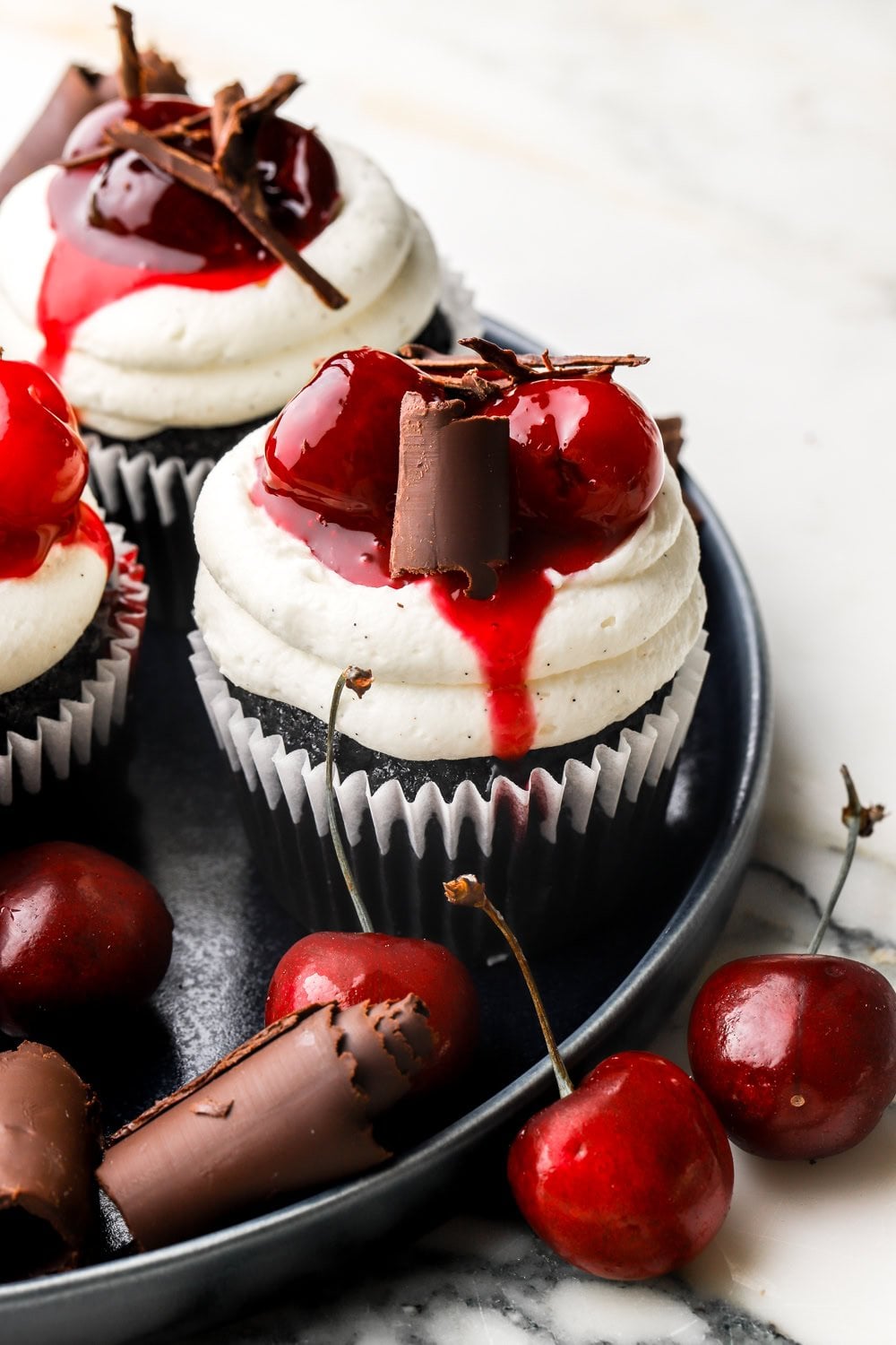 The best black cocoa cupcakes frosted with a mascarpone whipped cream and topped with a black cherry topping and dark chocolate curls.