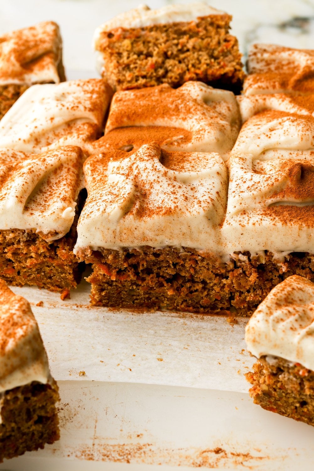 A cross between carrot cake and cookies, these carrot cake cookie bars are packed full of cozy spices and they’re dense and chewy like a cookie. Frost them with cream cheese frosting and little dusting of ground cinnamon and/or pecans.