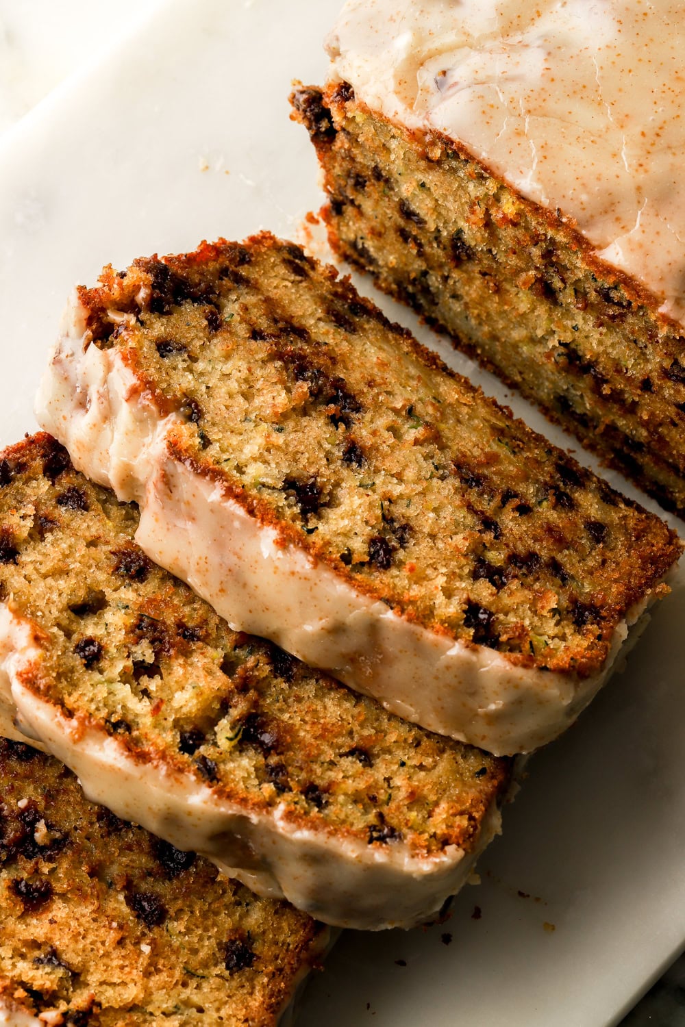 I took my perfect zucchini bread base and turned it into the best melt-in-your-mouth chocolate chip zucchini bread with a little bit of browned butter for extra toastyness. Top it with the best brown butter glaze for a little extra umph.