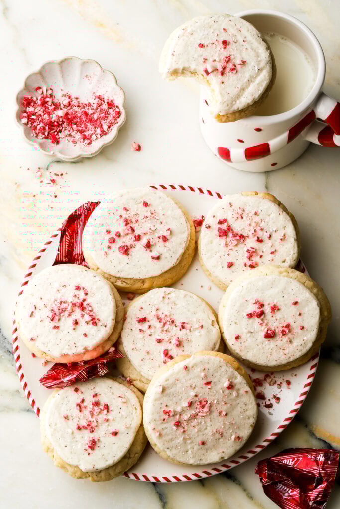 Super soft and buttery sugar cookies frosted with a light and creamy peppermint frosting and topped with chopped peppermint chocolates and shimmery sprinkles.