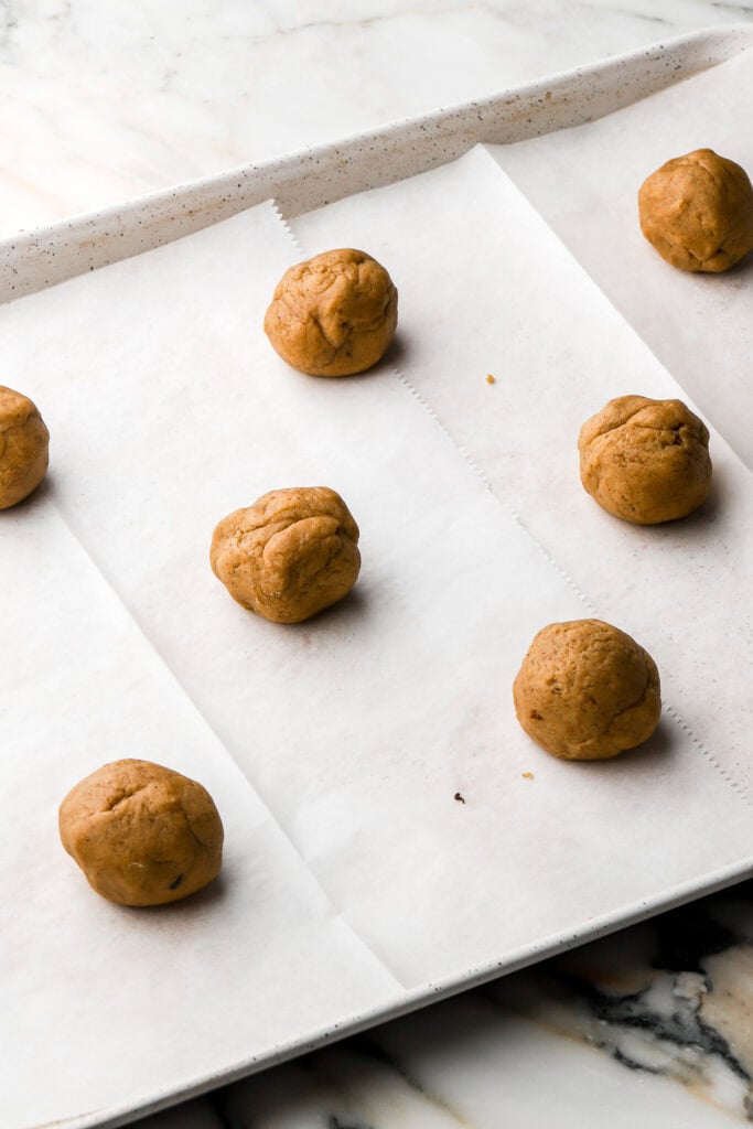 Chill the cookie dough balls again, I do about 15-30 minutes in the freezer while the oven preheats and then place them two inches apart on a cookie sheet.