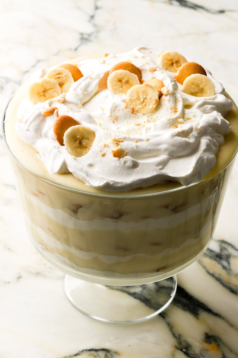 whipped cream topped with banana slicesvanilla wafers on top of banana slicesvanilla pastry cream on top of vanilla waferswhipped cream on top of vanilla pastry creamtop layer of vanilla wafersBanana pudding fully assembled in a trifle dish
