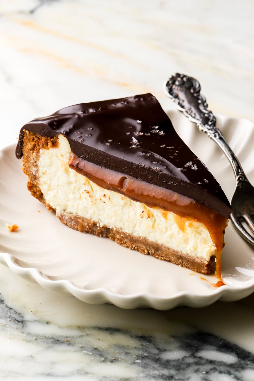 Creamy vanilla cheesecake baked on top of a shortbread crust and topped with homemade salted caramel sauce and chocolate ganache.